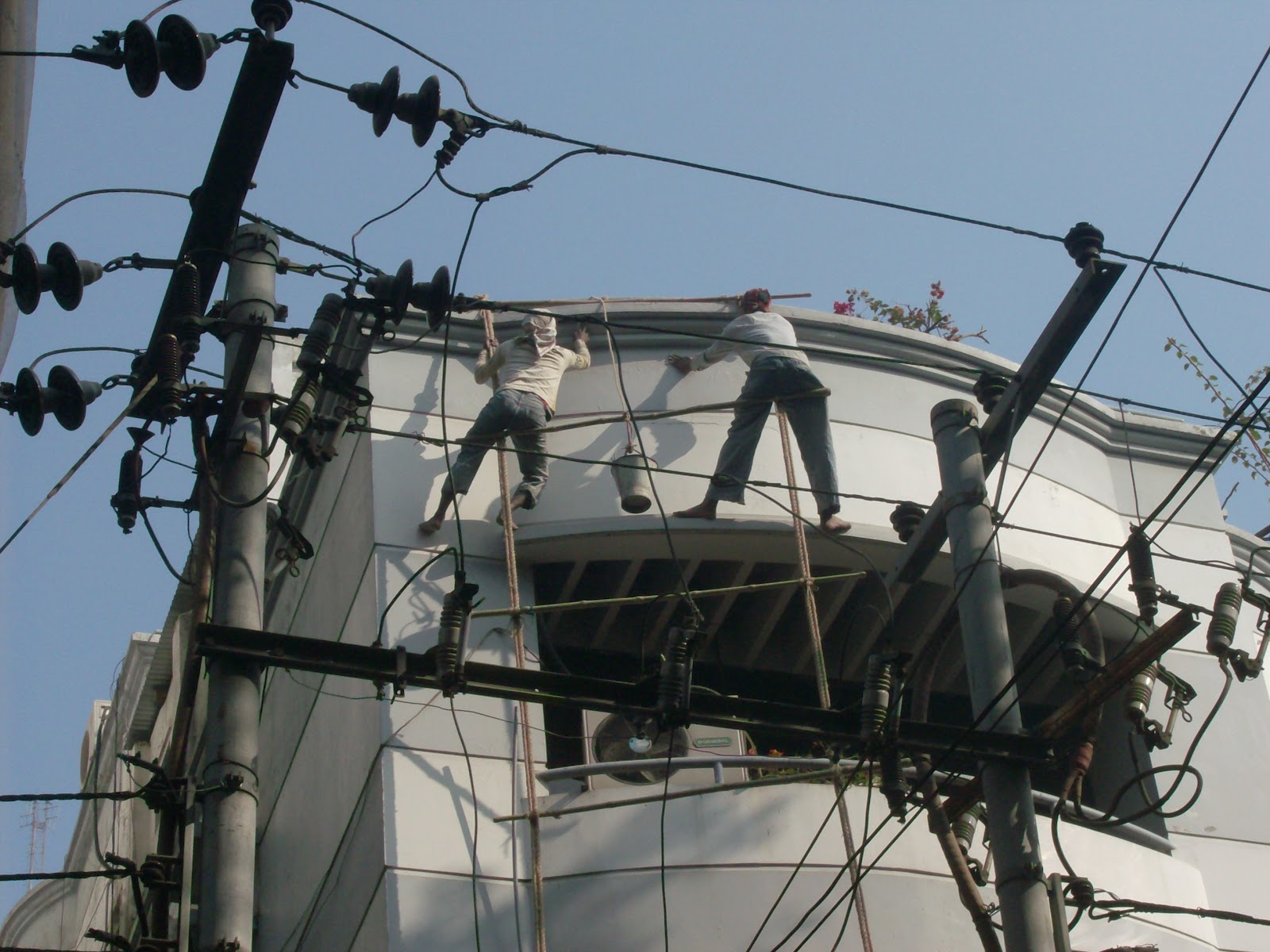 Workers across the street from our apartment painting .... balancing on a rope and bamboo and bare feet!