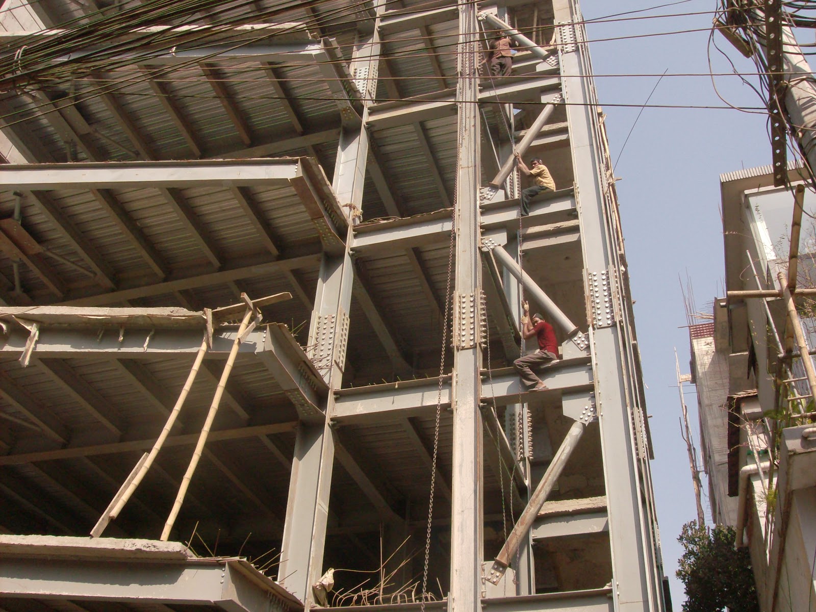 No cranes for these guys ... just hauling up a steel beam with a chain!