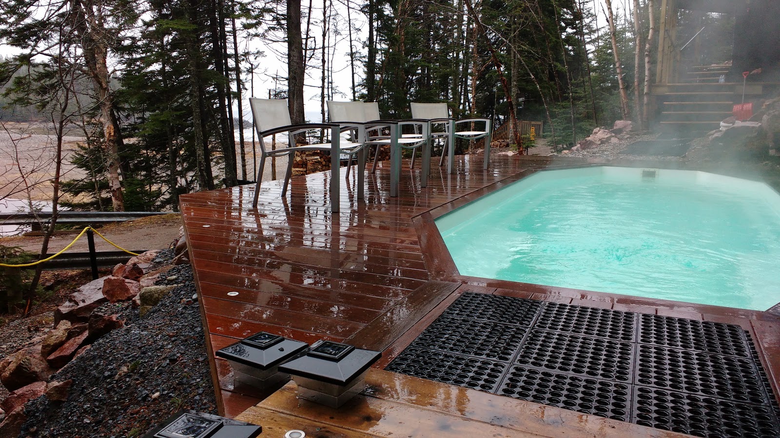 Hot tub surrounded by woods and Bay of Fundy views. |